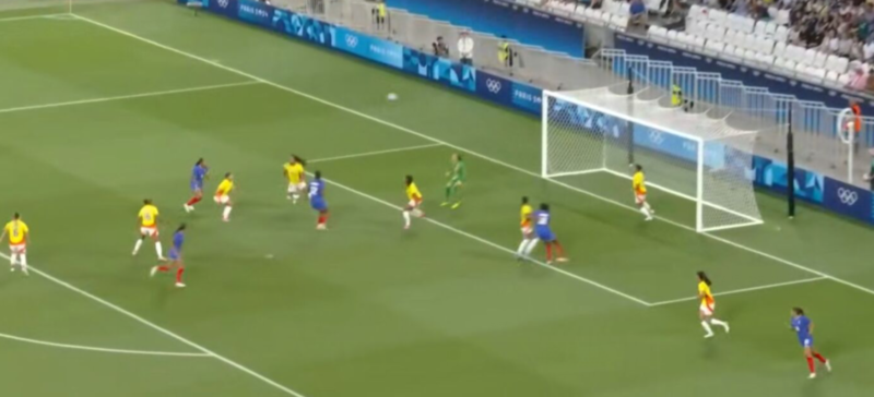 第43分钟,法国队送出长传。卡托托在禁区内护球。然后她传了球。迪亚尼摆脱了两人的逼抢,从禁区左侧将球传出。卡托托再次头球破门。顶球完成双比分,法国队3-0领先。
