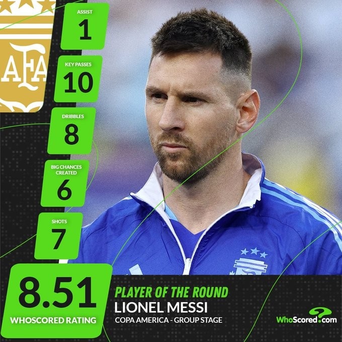whoscored评选出美洲杯小组赛最佳,阿根廷队长梅西以场均8.51分当选。